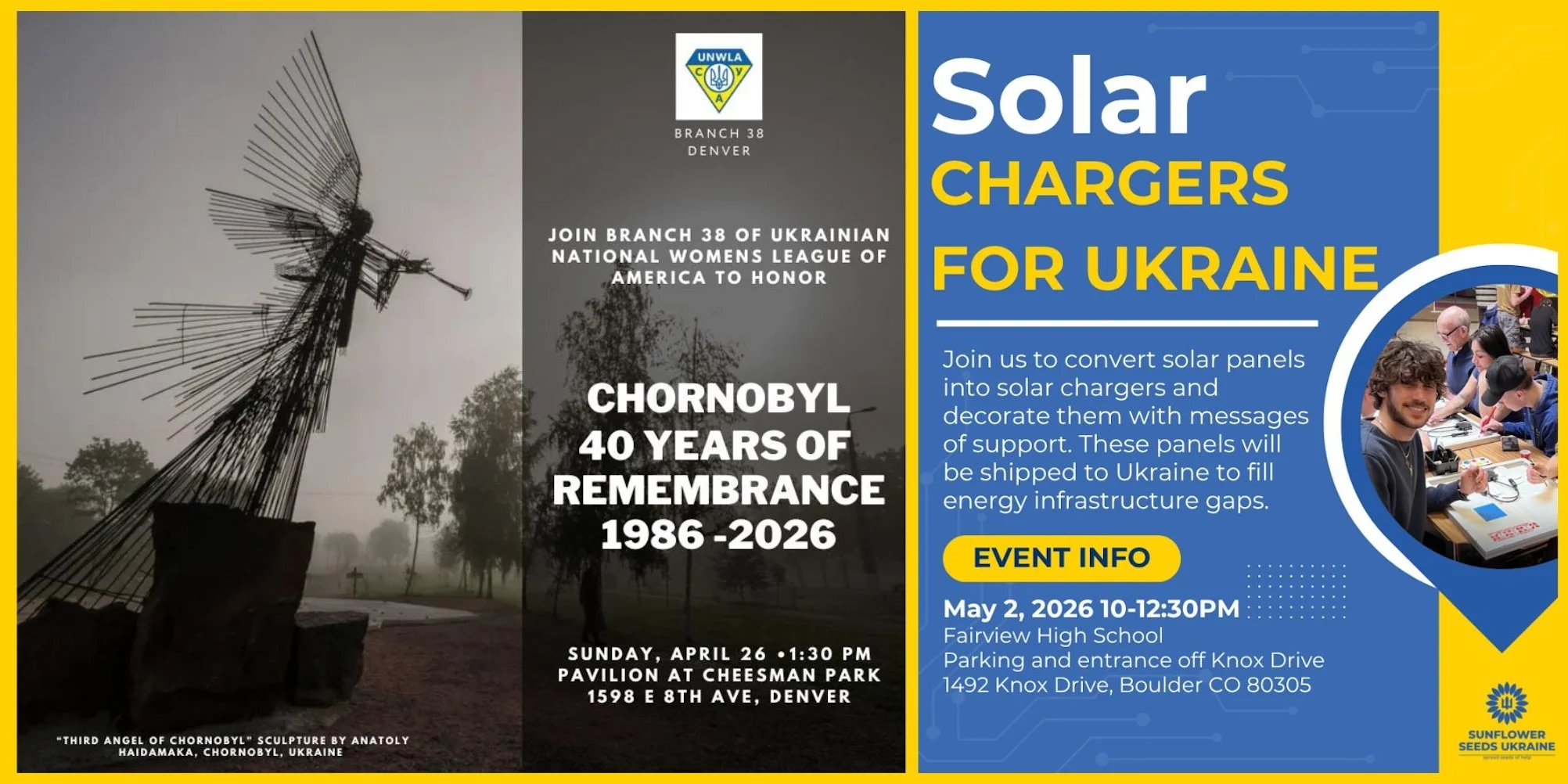 April 26: 40th Anniversary of the Chornobyl nuclear disaster commemoration ceremony at Cheesman Park in Denver at 1:30 (see flier below) followed by the Ukrainian Film Series “Freedom Under Fire: Ukraine in Three Films” doors open at 3:30 at the Buell Public Media Center (sponsored by Ukrainians of Colorado).