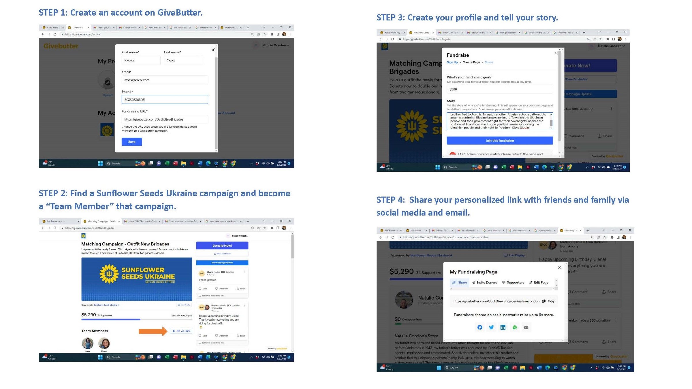 Peer-to-peer fundraising is an effective and fun way to raise awareness and money for causes you care about, among your friends. Now you can help raise more for your favorite Sunflower Seeds Ukraine campaigns by adding photos, a story, and a goal to your personal Team Member page.
