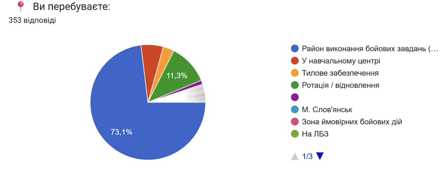 Згідно з опитуванням, абсолютна більшість отримувачів нашої допомоги перебувають у районі виконання бойових завдань, на ротаціях та відновленні; значно менше - у навчальних центрах та у тиловому забезпеченні.