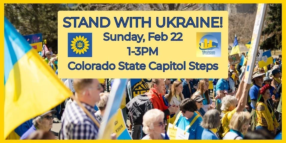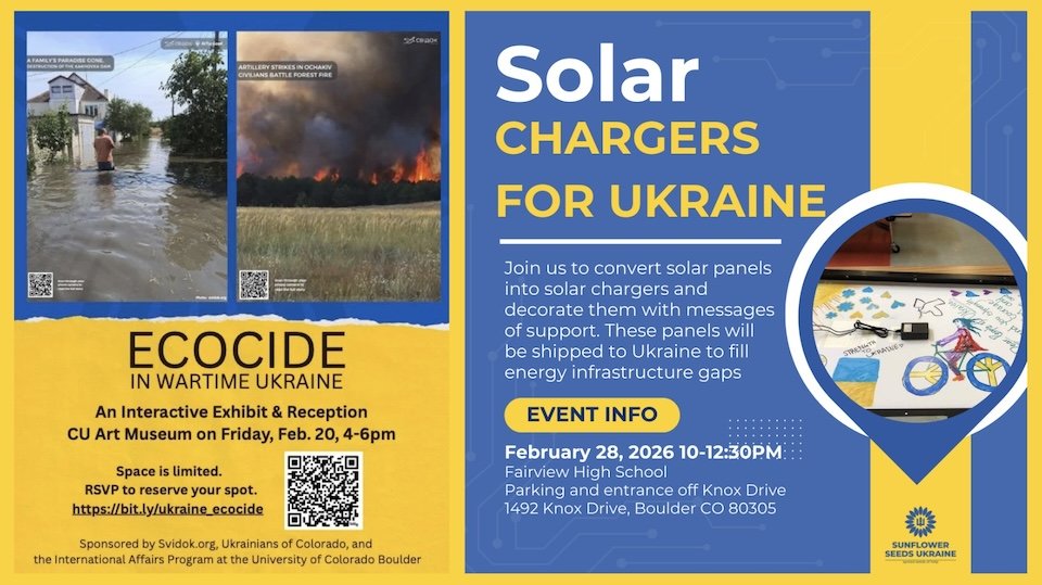 This February, as we mark four years since the full scale invasion, let your voice be heard at the Rally for Ukraine on Sunday, February 22nd on the Denver Capitol Steps organized by Ukrainians of Colorado; let your actions make a difference at the Solar Chargers for Ukraine Event on Saturday, February 21st at Fairview High School in Boulder; and let your awareness spark action by learning more at the Interactive Exhibit of Ecocide in Wartime Ukraine on Friday, February 20th at the University of Colorado Art Museum in Boulder. For more details, please visit our events website.