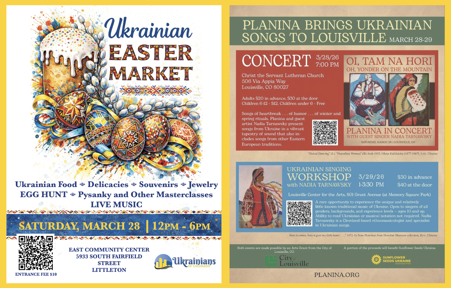 Please join us at the Ukrainian Easter Market on Saturday, March 28th and for a special weekend of Ukrainian folk music (Concert, March 28th/Workshop, March 29th) with special guest Nadia Tarnawsky. A portion of the proceeds will be donated to Sunflower Seeds Ukraine. For more details on these events and additional events, please visit our events website.